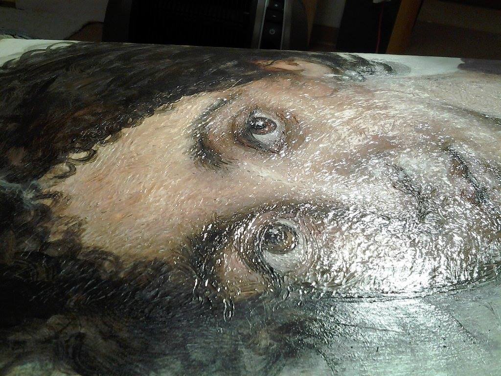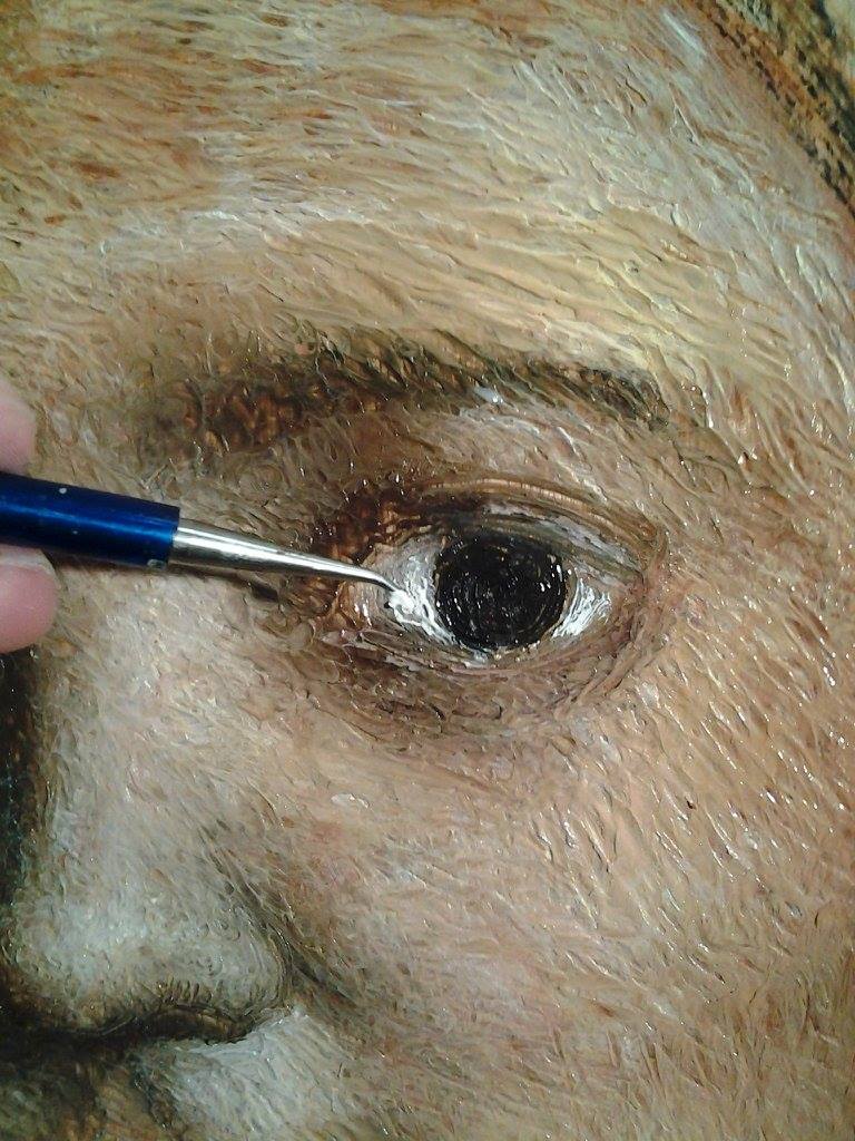 I continually work on the face, adding paint, transparent wax, and fusing with the heated tool.