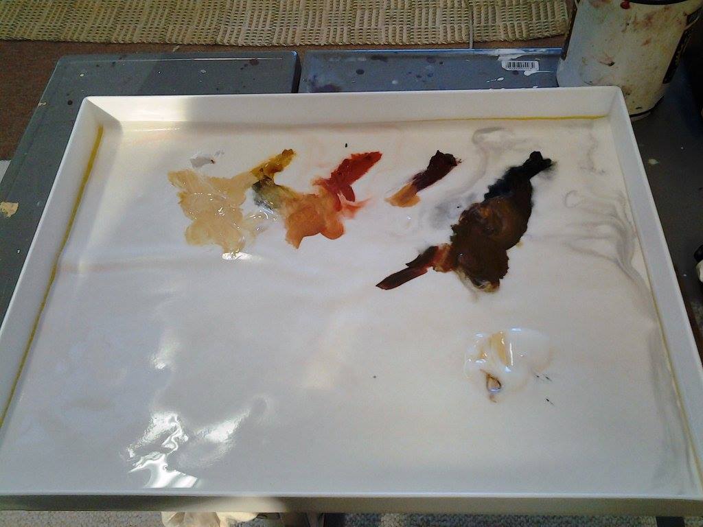 Under different lighting conditions. I add the Ceracolors wet, allow it to air dry, then add a transparent layer of Ceracolors Gel, before using the heated tools to manipulate the paint.
