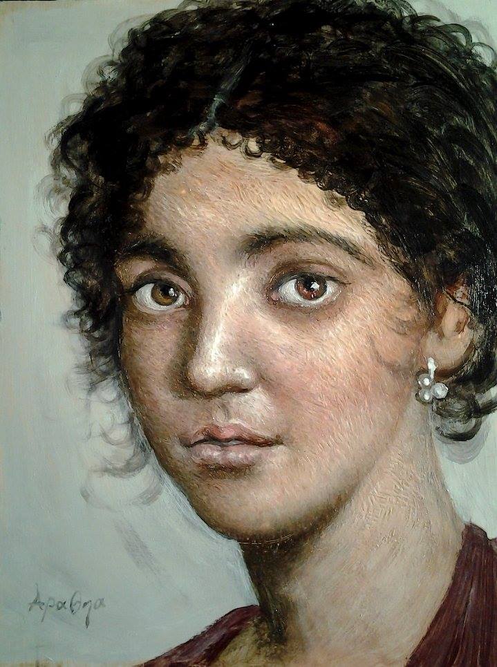 I found that the Sta-Wet palettes are fabulous for Ceracolors. Since they’re water-based, the palette keeps the paints wet for a long time. The colors I used in this portrait are Titanium White, Yellow Ocher, Mars Red (Yellow Shade), Mars Violet and Carbon Black, all colors used by the Greeks. Even Titanium White is believed to be similar to the ancient Melinum—a naturally occurring titanium-kaolinite mineral.